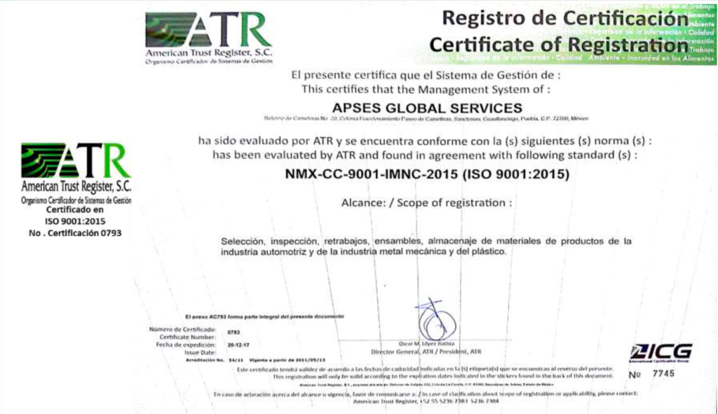 Actualmente estamos certificados en la Norma ISO 9001:2015, El Organismo certificador es AMERICAN TRUST REGISTER, S.C.